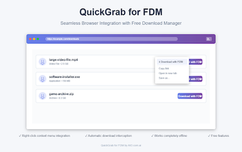 QuickGrab для FDM — это дополнение Chrome, предназначенное для оптимизации процесса загрузки, интегрируясь с Free Download Manager. Этот инструмент позволяет пользователям значительно ускорять загрузки, предлагая такие функции, как автоматическое перехватывание загрузок и интеграция в контекстное меню. Пользователи могут легко отправлять любую ссылку на загрузку в Free Download Manager простым щелчком правой кнопки мыши, что обеспечивает более быстрые и надежные передачи файлов.